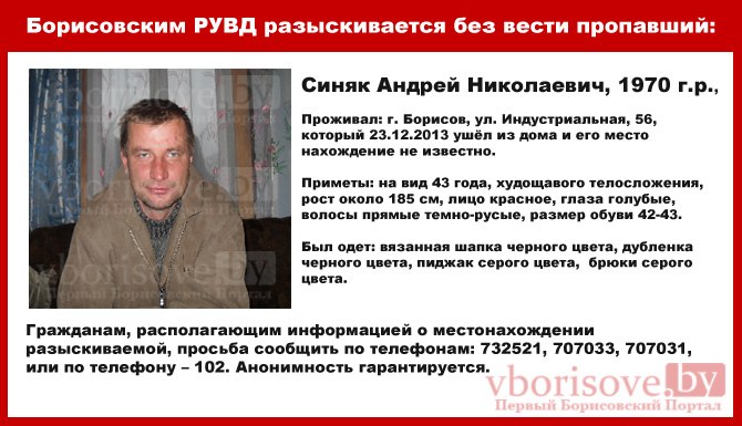 Синяк Андрей Николаевич, 1970 г.р., проживал: г. Борисов, ул. Индустриальная, 56, который 23.12.2013 ушёл из дома и его место нахождение не известно.