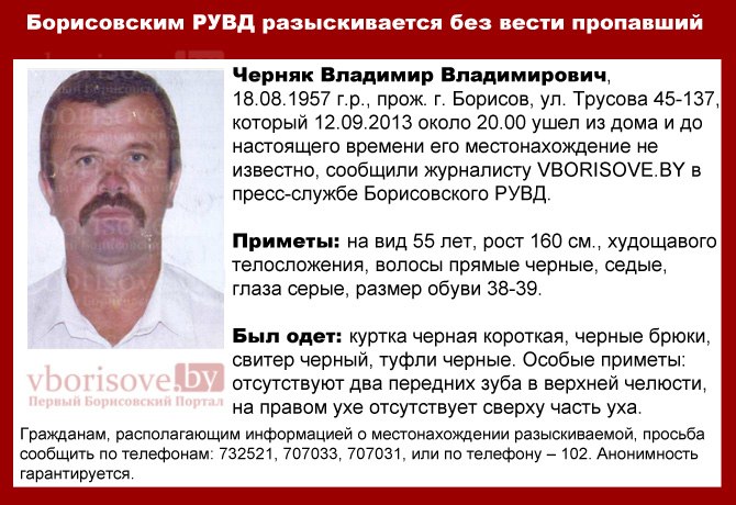 Борисовским РУВД разыскивается без вести пропавший Черняк Владимир Владимирович, 18.08.1957 г.р., прож. г. Борисов, ул. Трусова 45-137, который 12.09.2013 около 20.00 ушел из дома и до настоящего времени его местонахождение не известно, сообщили журналисту VBORISOVE.BY в пресс-службе Борисовского РУВД.