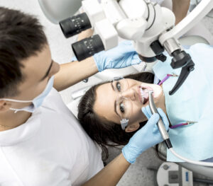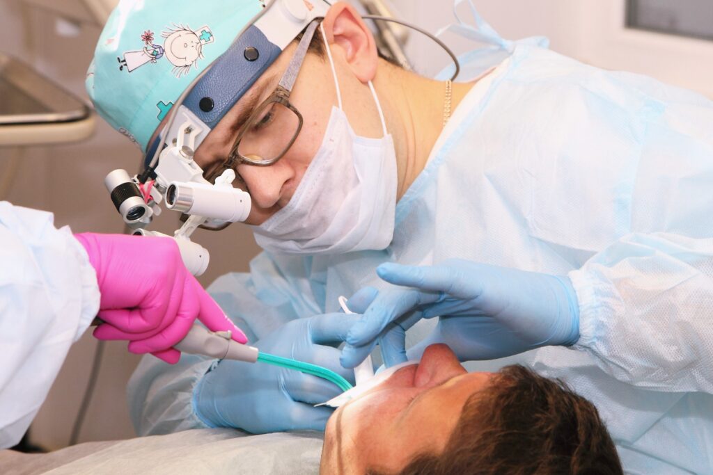 - Врач усаживает пациента в стоматологическое кресло, располагая над ним микроскоп. Он поможет максимально быстро и эффективно обнаружить степень травмирования тканей.
