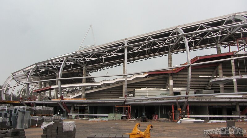 На стадионе началась установка сидений и решеток перед первым рядом. Идут работы на крыше, в подтрибунных помещениях и вокруг стадиона.