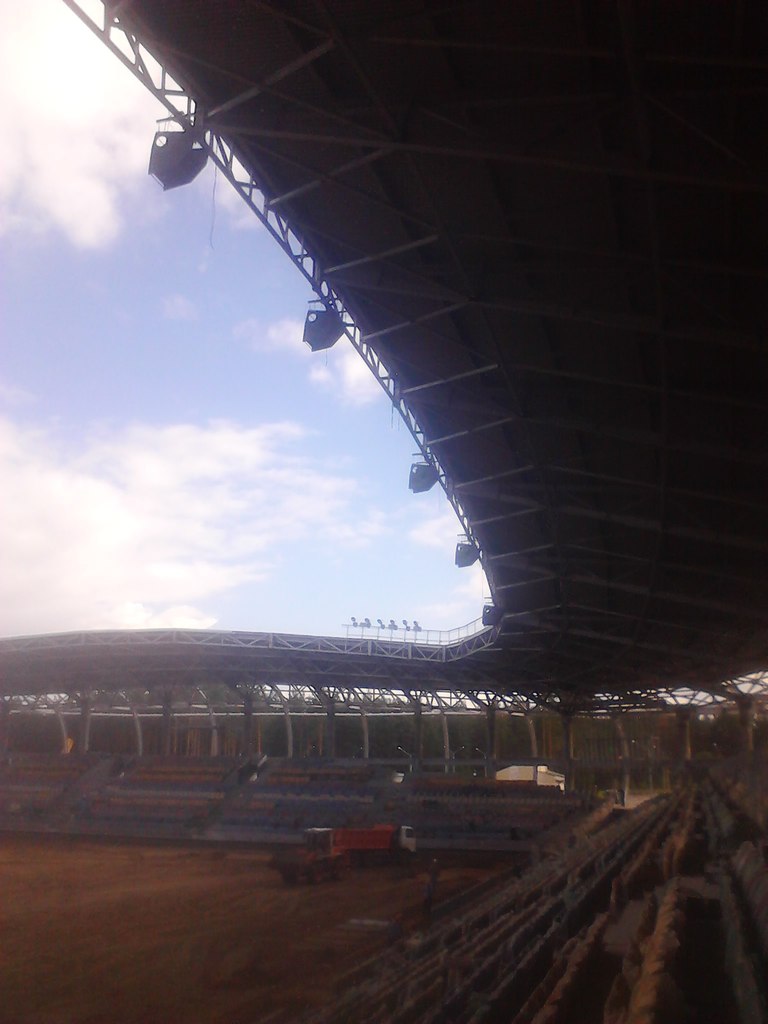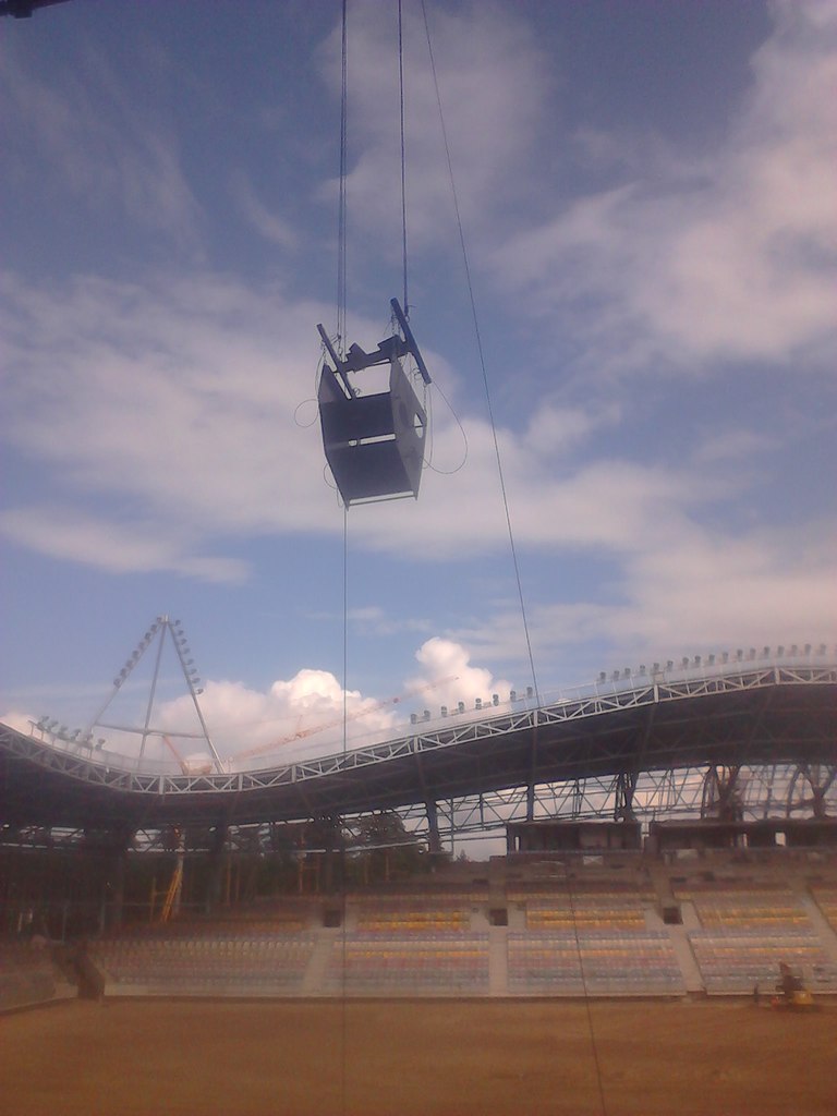 Как сообщил Илья Дайнеко на страничке ВКонтакте «Мой Барысаў«, на стадионе ФК БАТЭ начался монтаж акустики. Монтаж ведется в ручную. Одна такая колонка весит до 200 кг. Всего на стадионе будет 60 точек акустики и сабов.