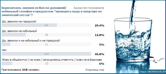 Чтобы ответить на этот вопрос сайт vborisove.by запустил опрос в соц.сети ВКонтакте: «Борисовчане, звонили ли Вам на домашний/мобильный телефон и предлагали «проверить воду в квартире на химический состав»?». За 48 часов в опросе приняло участие 218 человек (подписчики страницы «МОЙ БОРИСОВ»):
