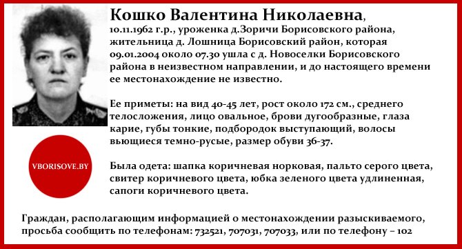 Кошко Валентина Николаевна, 10.11.1962 г.р., уроженка д.Зоричи Борисовского района, жительница д. Лошница Борисовский район, которая 09.01.2004 около 07.30 ушла с д. Новоселки Борисовского района в неизвестном направлении, и до настоящего времени ее местонахождение не известно. Ее приметы: на вид 40-45 лет, рост около 172 см., среднего телосложения, лицо овальное, брови дугообразные, глаза карие, губы тонкие, подбородок выступающий, волосы вьющиеся темно-русые, размер обуви 36-37.